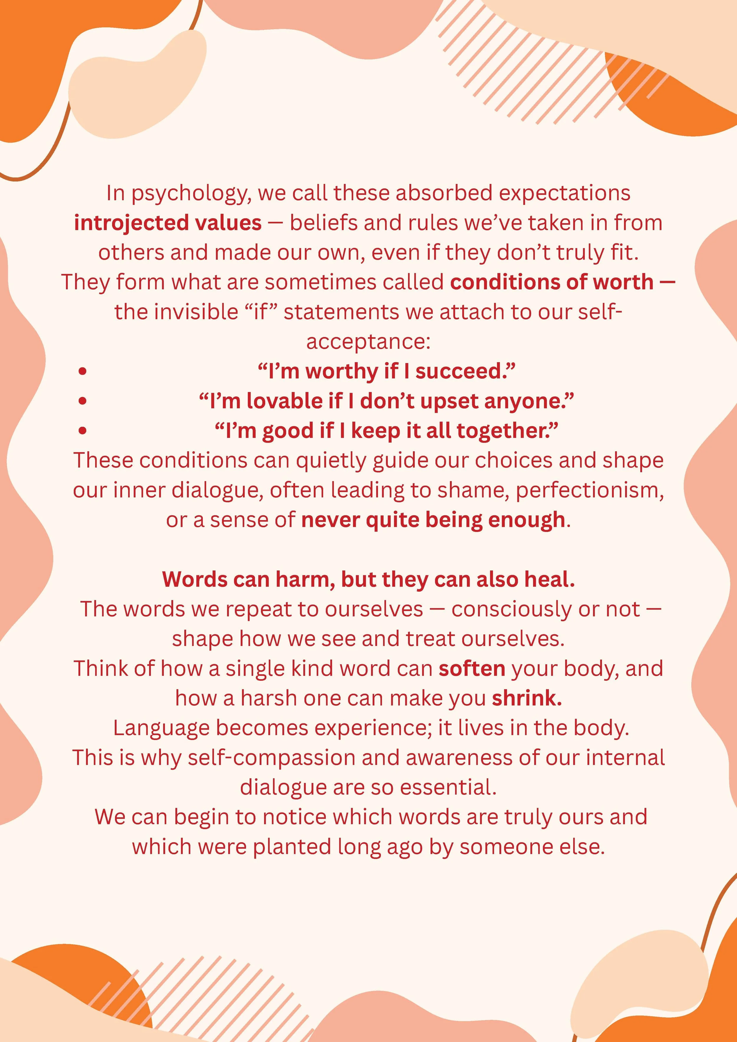 Throughout life, we collect labels and messages — some given to us by others, some we take on ourselves. Over time, these can quietly shape how we see ourselves, how we relate to others, and what we believe we’re allowed to need or feel. This set of resources invites gentle reflection on the stories you may be carrying, and offers a compassionate way to understand yourself more fully.
