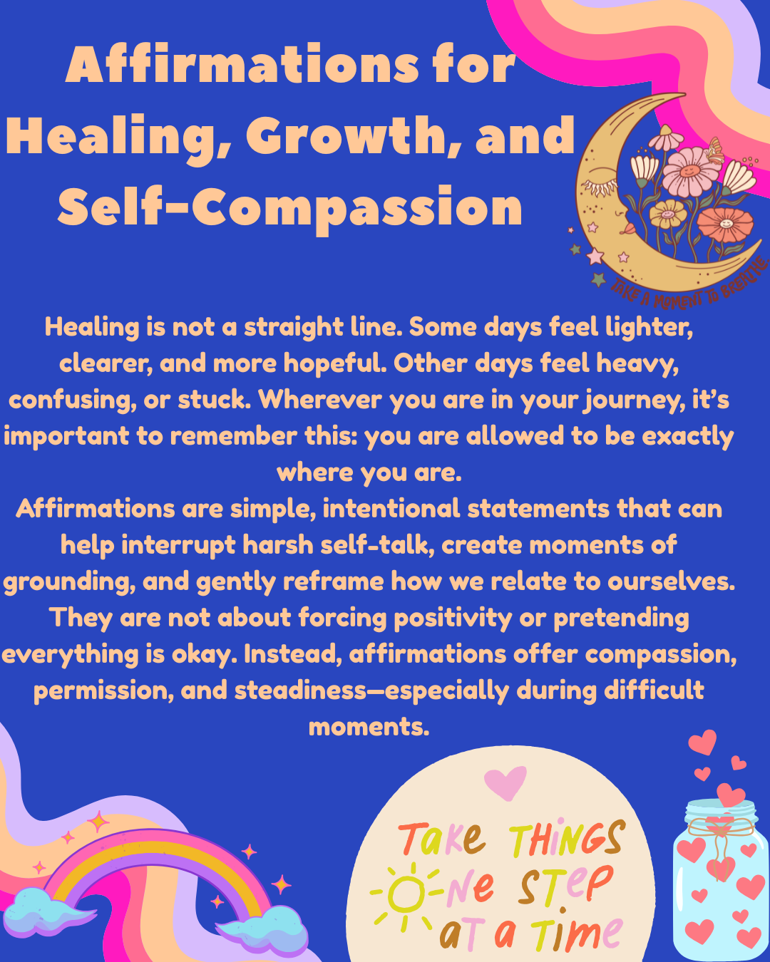 Affirmations are simple, intentional statements that can help soften harsh self-talk, create moments of grounding, and support emotional regulation. They are not about forcing positivity or pretending everything is okay. Instead, affirmations offer steadiness, permission, and compassion — especially during difficult or overwhelming moments.