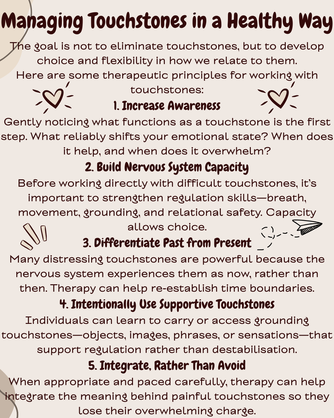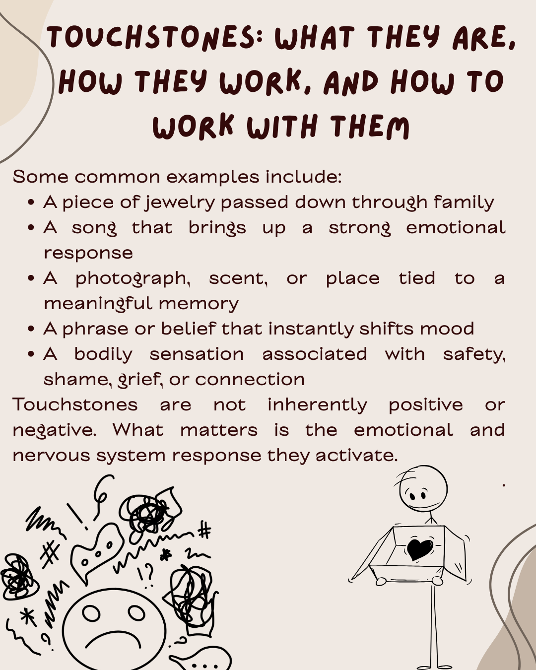 Touchstones are experiences, objects, sensations, or memories that carry emotional meaning. They can quietly shape how we feel, react, and understand ourselves — often without us realising why. These resources explore how touchstones form, how they affect the nervous system, and how they can be worked with in supportive, compassionate ways.